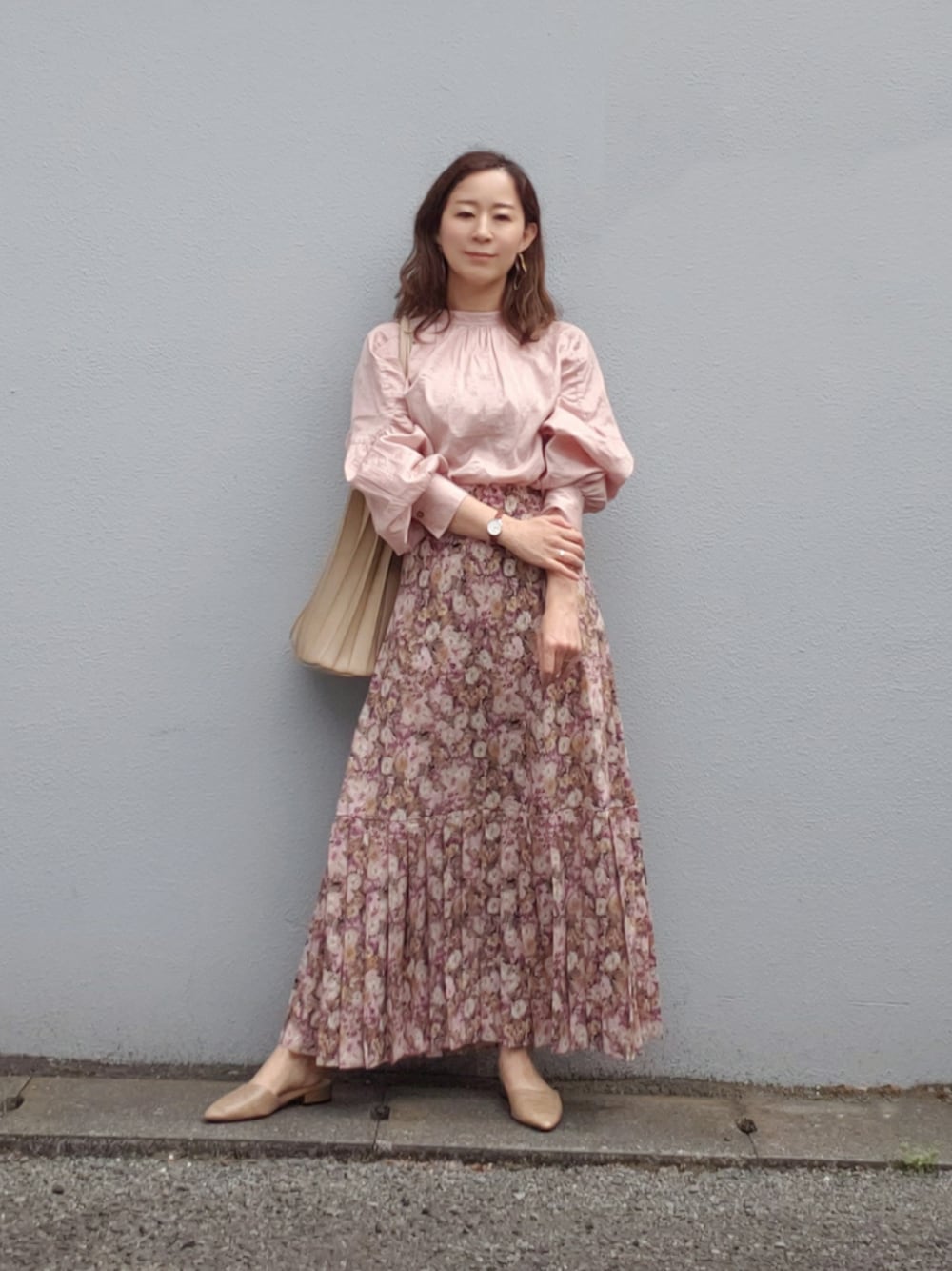 少しくすんだ花がらと裾部分のプリーツが可愛いスカートを発見😍 floristさんのバッグは軽量で大容量なので便利です💕