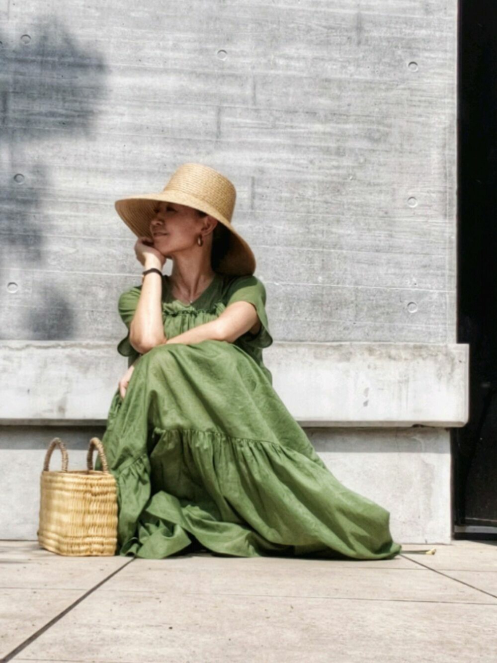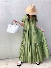 おはようございます。 ヘレンチアさんのティアードワンピ、シアー素材で透け感のあるグリーンがきれいで、何度か誉められました😍 たっぷり入ったギャザーが風を含んで、歩くととっても可愛いです。 かごバッグを合わせて夏らしく、、、🌻