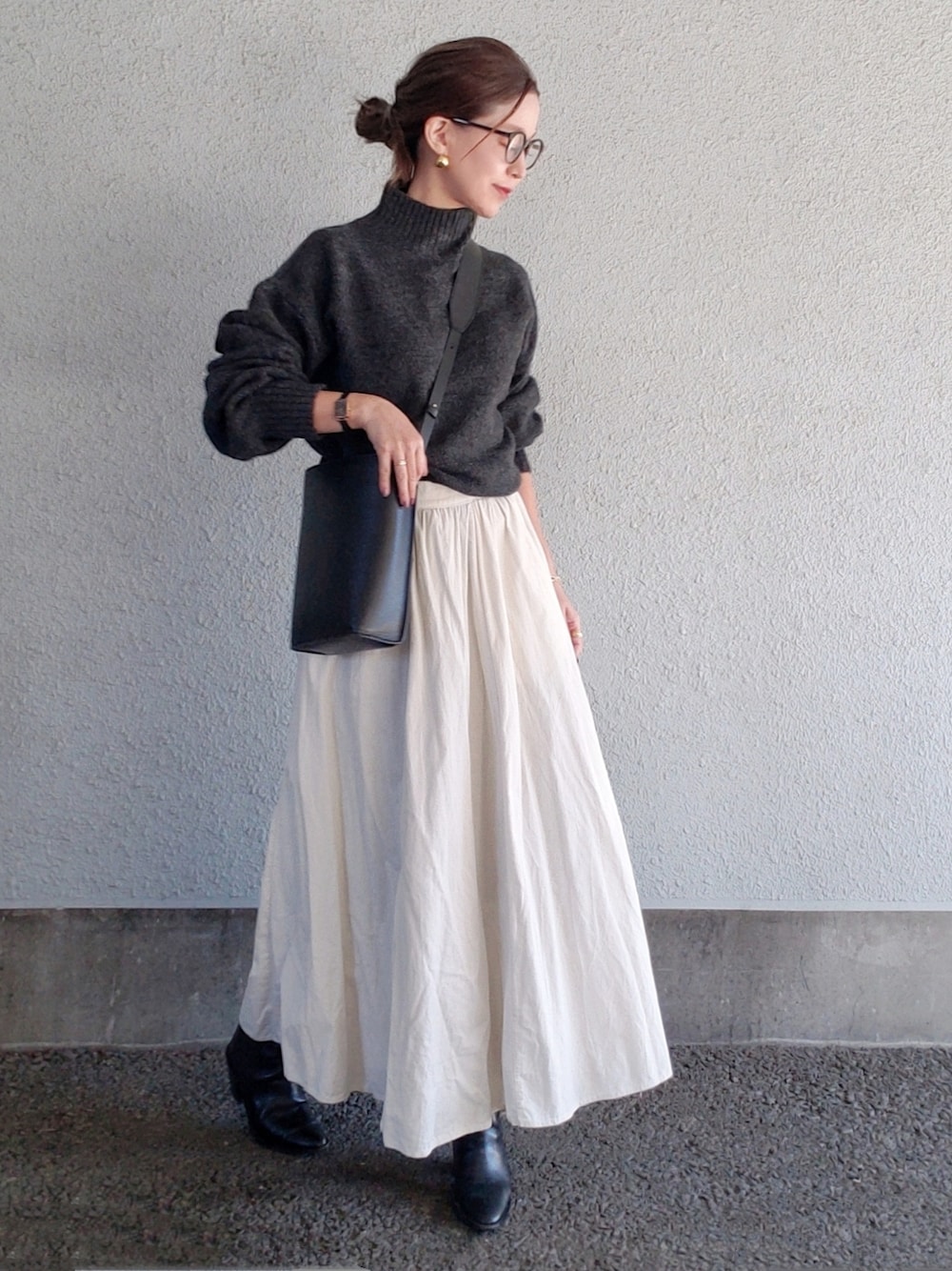 andMEさんのハイネックを着用しています。 ふんわり柔らかい素材感&厚過ぎず薄過ぎずでとても着やすいです。