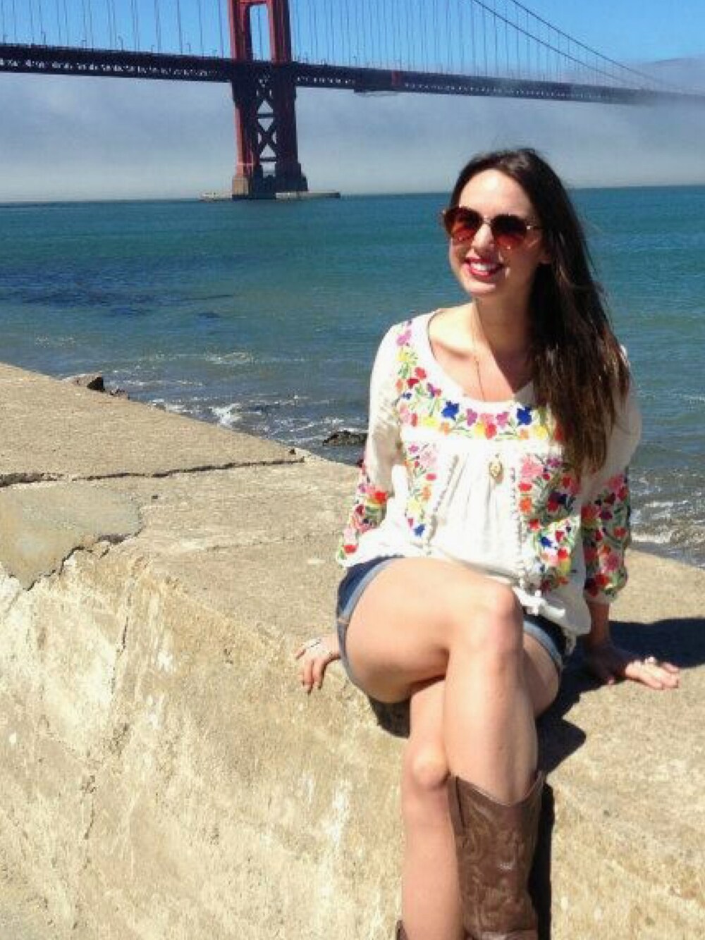 Embroidered shirt, denim shorts, and cowboy boots in SF