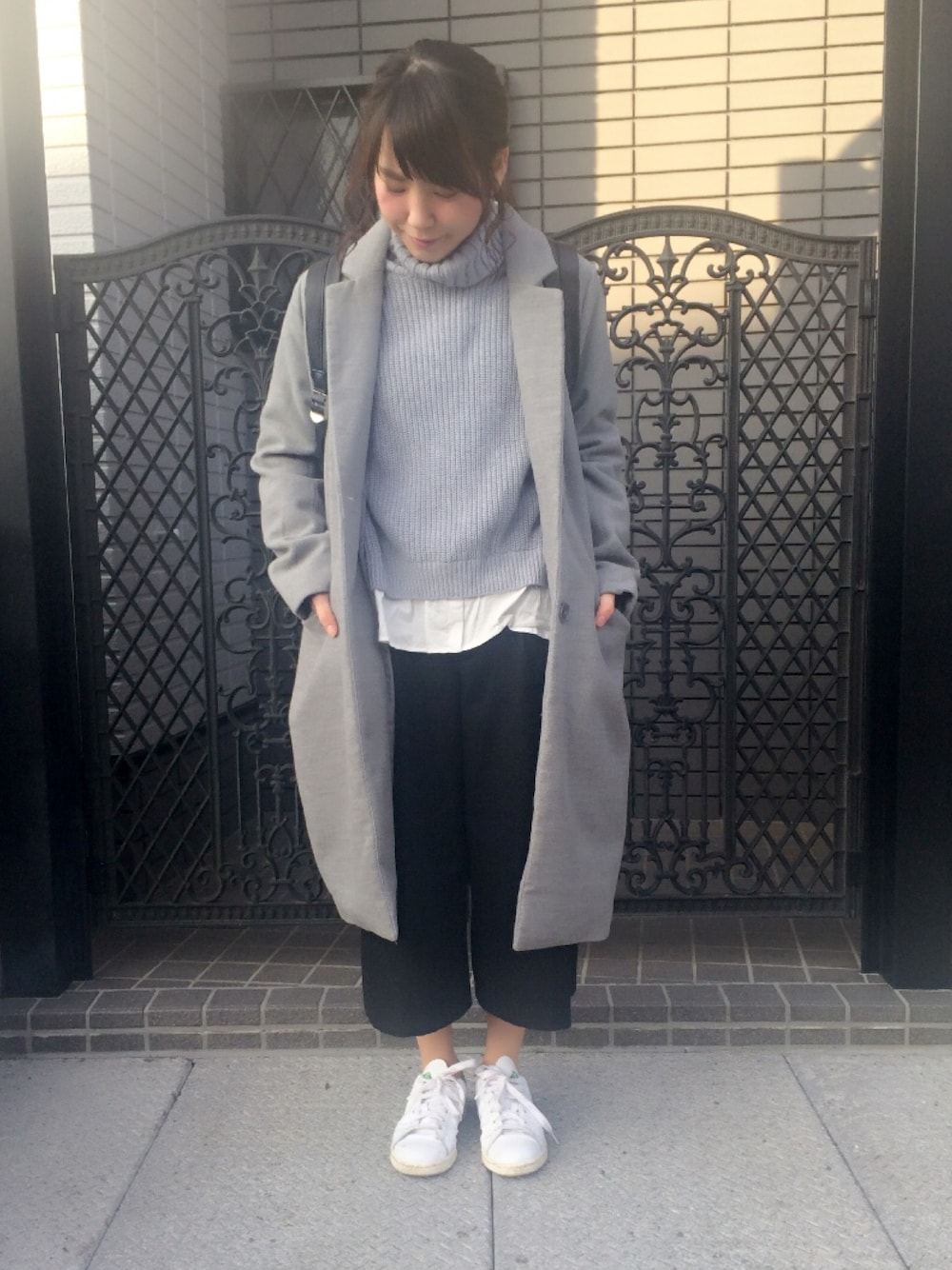 こんばんは♪( ´▽`) グレーのニット×グレーのアウターの合わせが好きでよく組み合わせます。 ワイドパンツにスニーカー楽すぎる!