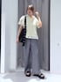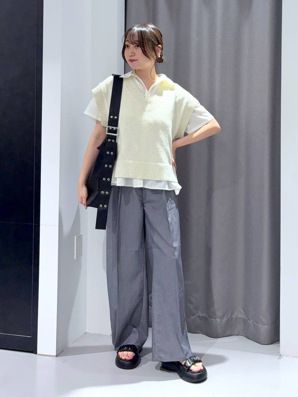 *ベスト スパンコールが散りばめられた 薄手のニット素材のベスト! ニット素材ですがサマーニットで 暑い時期でも着やすいです! フレンチスリーブで脇の付け根が隠れるので インナーをキャミやタンクトップにしても 使いやすいので夏も使えて着回し力◎ アイボリーはスパンコールの色もクリアカラーで 控えめな印象なので挑戦しやすいです🫶 *シャツ 胸元のシャーリングデザインが可愛いシャツ! シャーリングの部分はゴムで 伸縮性◎なので着心地も苦しくないです! 着膨れが心配でしたが、 ウエストくらいまできゅっと見える シャーリングの入り方なので 思ったより着膨れずに着られました! 上の方のボタンを開けるとより着膨れないです◎ *スラックス 流行りのサイドラインが可愛いスラックス! ジャージっぽくなって不安、、という方も センタープレス入りのスラックスなので きちんと感があり部屋着感が出にくいので 挑戦しやすいアイテムです! 後ろはゴムでウエストもキツくないです! 私は今回丈長めで着用したかったので 私はLサイズを買いました☺︎ 161cmLサイズでくるぶしが隠れて 裸足だと床に着くかなくらいです! ワイドめなストレートシルエットで 脚のラインも拾わず楽に着られます◎ シワも気になりにくく使い勝手抜群でした!