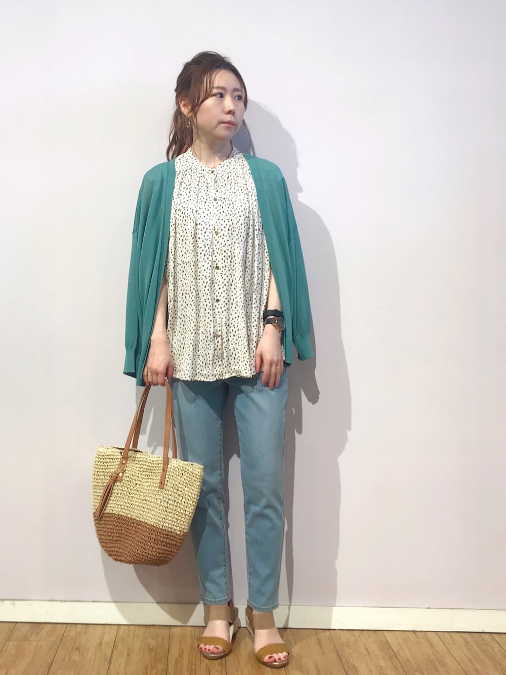 ご覧いただきありがとうございます♪ デニムスキニーを使用したキレイ目カジュアルなスタイリング。 合わせたサテンブラウスは全体的にギャザーが入っていて、ふんわり女性らしいシルエットです☺️ 落ち感のあるサテン生地で体型カバーもバッチリ👌 サッと羽織れるトッパーカーディガンは、接触冷感の夏には嬉しい機能付きです☆