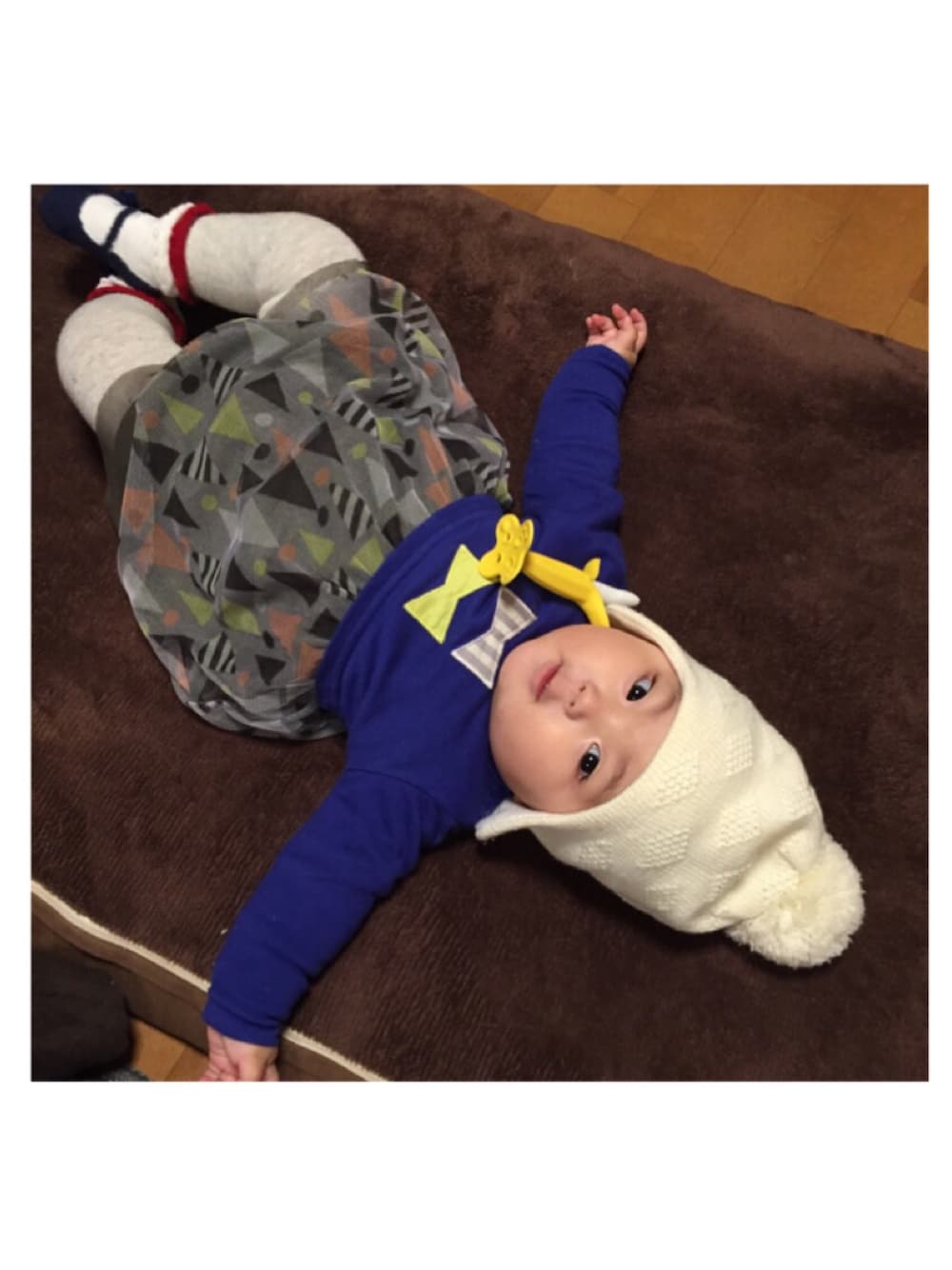 そして娘ちゃんはブルーコーデ❤️ まだ髪の毛が少ないからニット帽かヘアーバンドとかしないと男の子の間違えられる😭 ワンピ着ててもピンク着てても‼︎