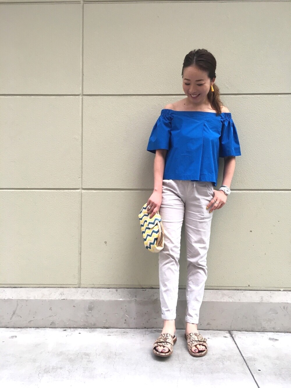 いよいよ夏本番🍉🍉🍉 オフショル✖︎ブルー🏝のお気に入りトップスをメインにコーディネート❤️ ラスト一点のオススメアイテムです🙆🙆🙋💓 こちらのクラッチも万能アイテム😋収納力も抜群です❤️