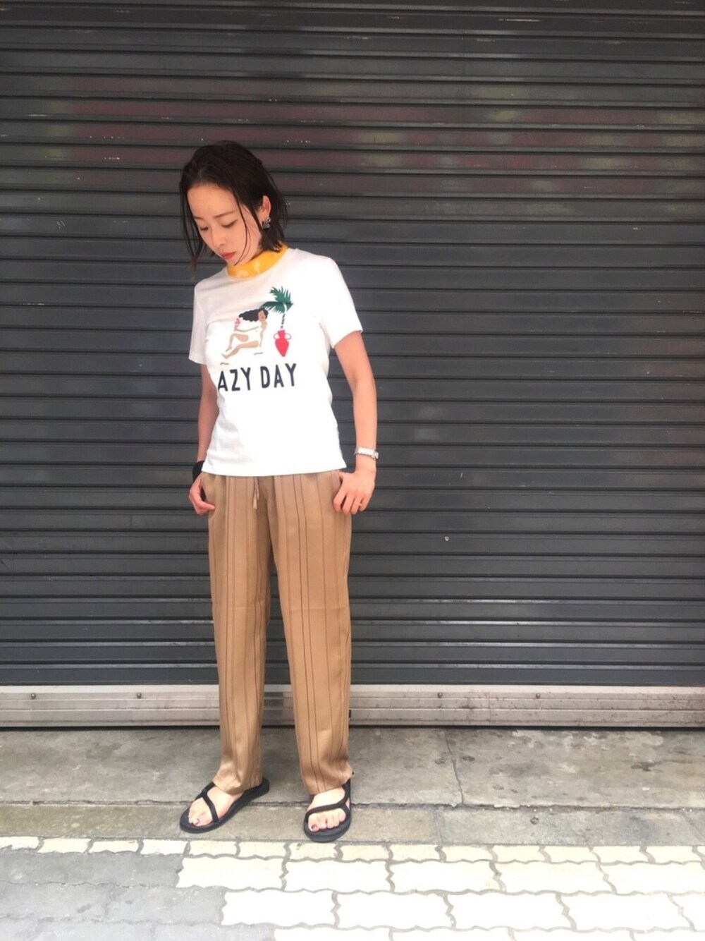 Tシャツの文字通り、、🌻🍉 lazy day(のんびりした日) なスタイリングに🏝✨ カジュアルなTシャツスタイルにも、サテンパンツが大活躍♥️🥺 大人なカジュアルスタイルに使えるサテンパンツはこの夏大活躍です🥰