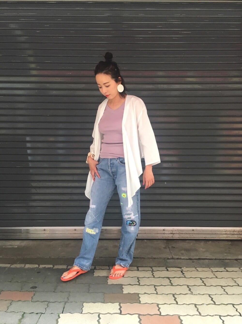🌻デニム✖︎白シャツ🌻 定番のコーディネート小物で遊べば雰囲気がスッキリ変わりますよ😆🌟 梅雨の季節☔︎だって、真夏もギョサンがあれば無敵ですw かなりお手頃なのでカラーで遊んでみました🌈😜