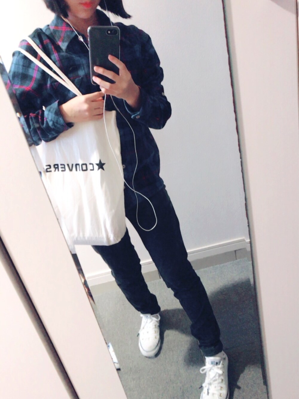 さっとコンビニにいく感じです ラフラフ~ イヤフォンが似合うコーデ