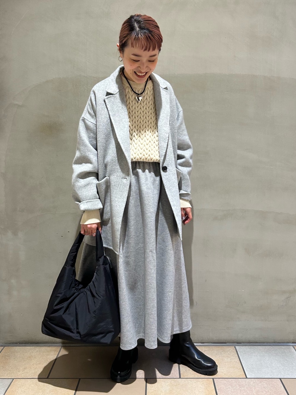 ご覧いただきありがとうございます。 コートとスカートをセットアップ風に着てみました。ニットはボリュームがあるので前だけインしてます。