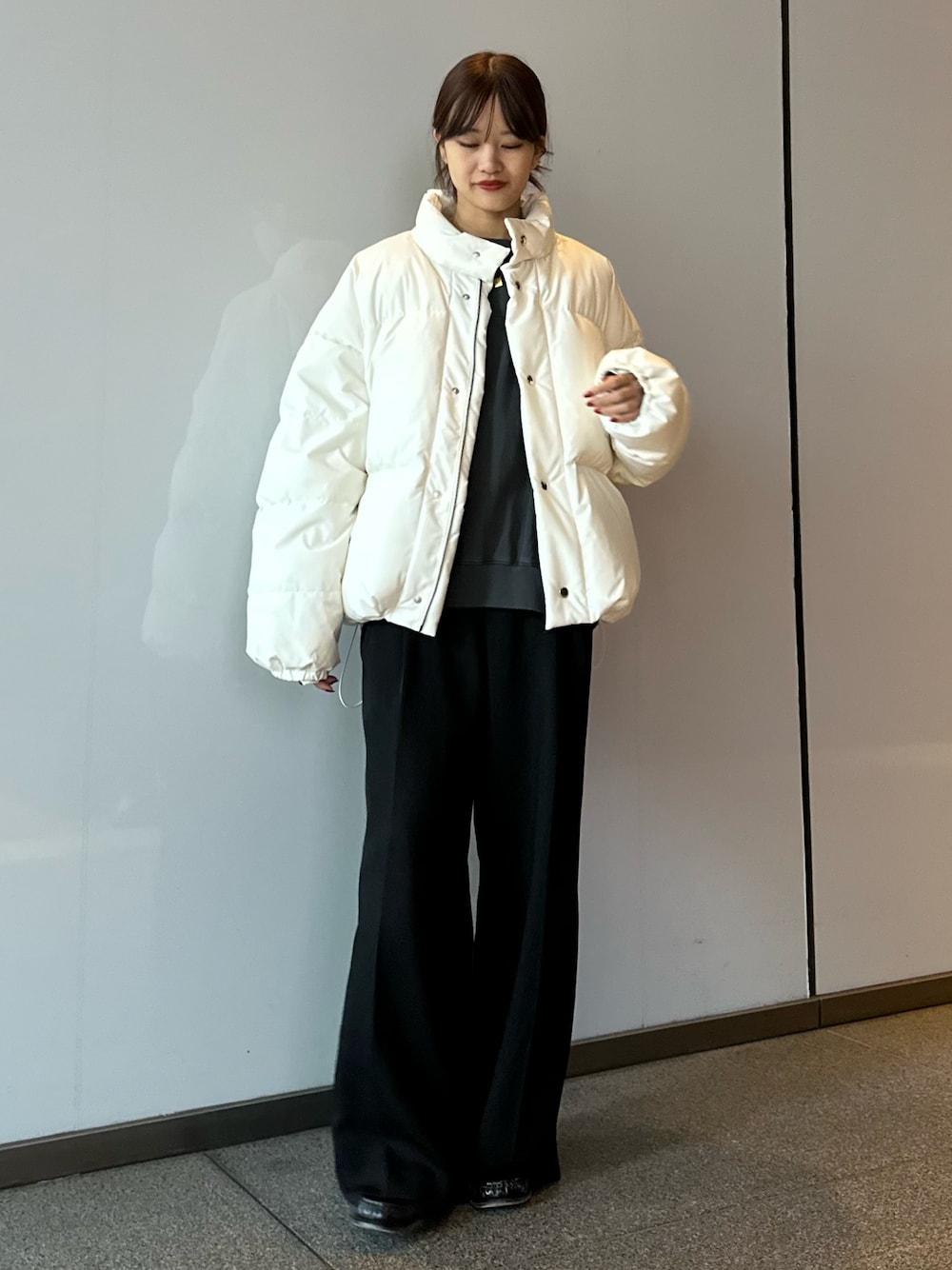 164cm / 骨格ウェーブ ◼︎ ホワイトグースショートダウンジャケット / Sサイズ着用 とにかく軽い、保温性も抜群なダウンジャケット。 お尻が隠れるくらいのショートな丈感で、ややゆったりめ。 アームホールが広いので厚手のニットやパーカーも着込めます◎ ドローコード絞るとシルエットと丈感が変わり、ネックもスタンドになるのでカジュアル過ぎず、綺麗めな印象に。 デザインはすごくシンプルで使いやすいので、ワイドデニムや、綺麗めスラックスなど幅広いテイストで着て頂けます! ◼︎ 2タックベーシックワイドパンツ / Fサイズ着用 どんなスタイルにも合わせやすく、 絶対一本は持っておきたいワイドパンツ。 下に向かって落ちるシルエットが超キレイで、 履くだけでスタイルアップ確定◎ 生地感もしっかりめなので、 キレイめ/大人っぽいコーデが好きな方には 特にオススメのパンツです!