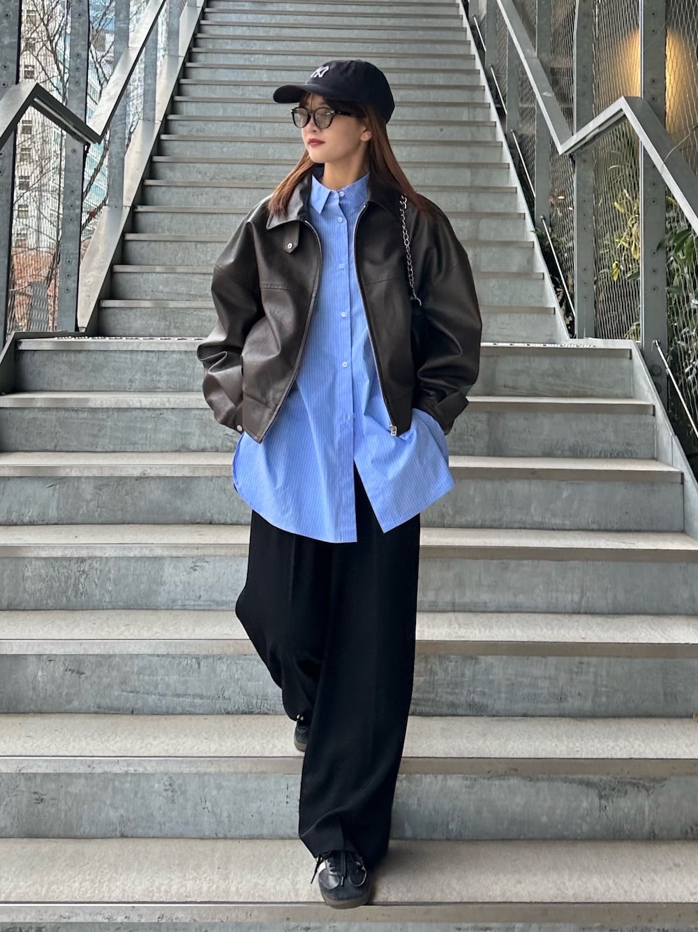 ◼︎ フェイクレザーブルゾン / Fサイズ着用 見た目以上に軽く、羽織りやすいレザーブルゾン。 ヴィンテージライクなデザインで、色んなコーデに馴染みやすいので着回し力も抜群! サイズ感もゆったりめで、ボリュームスリーブなので羽織るだけで存在感アップ◎ ブルゾンなのに、カジュアルすぎず モードに大人っぽく着こなせる1着です!