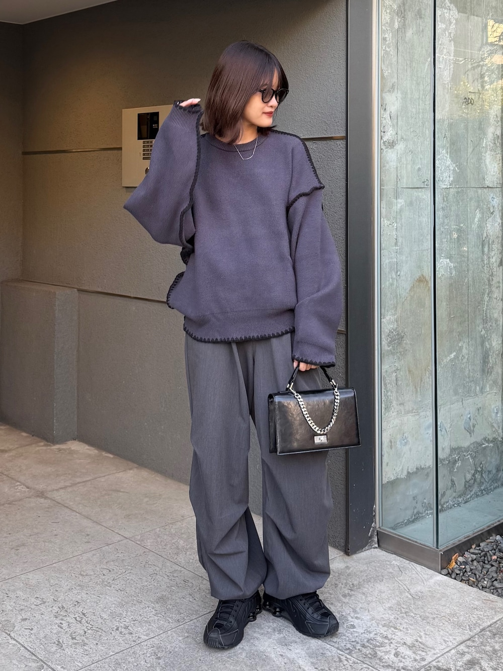 ◾︎クラフトステッチニット / Fサイズ着用 オーバーサイズでゆるっと着れる一枚。 チクチク感一切なく、モチッとした肌触りなので、スウェット感覚でラフに使いやすい。 ステッチのデザインがアクセントで、シンプルながら一枚でお洒落な万能ニットです。 ◼︎パラシュートスラックス / Sサイズ着用 裾が絞れるので、低身長さんでも、女の子でも履けるパンツ◎ かなり軽いので履きやすさも抜群! カジュアル、ストリートはもちろん、 ジャケットやシャツなどキレイめにも合わせられる万能アイテム! オールシーズンで使えるので、超オススメ。