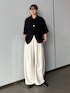 ■ 【CULLNI exclusive for Lui's】 半袖コーチシャツブルゾン 素材には、しなやかで落ち着きのある、ナイロンとポリウレタンの混紡素材を使用しています! コーチジャケットをモチーフになっています🙆♀️ 身幅と着丈を広く取った、ややルーズフィットなサイジング。 裾にはドローコードがついており、絞ってシルエットを調整頂けます。 ストリートな印象のコーチジャケットを上品な素材で仕上げた、クルニらしいアイテムです! ■ダブルクロスベーシックカーブパンツ/Sサイズ着用 やや厚めのしっかりした生地のスラックスで、トレンドのカーブシルエットだからスーツっぽく無くカジュアルにも合わせやすいのがポイント◎ めちゃくちゃ上品で綺麗見えするのに、ウエストが後ろ半分ゴム+ドローコード付きのイージー仕様なのでベルトなしでもラクに履けます。