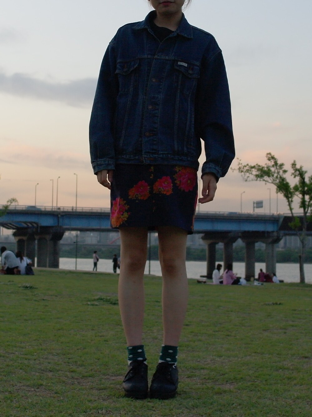 ブルー系のデニムジャケットを着用したレディースの夏コーディネートの1枚目の写真