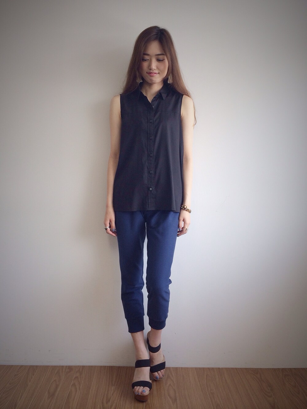 ウッドウェッジサンダルは見た目とのギャップにびっくりするほど軽くて歩きやすいです^^シャツブラウスの生地はローン生地なので、肌ごこちも良い仕上がりに。スタッフの考案から生まれた1枚です。ずっしりし過ぎない長さがいいです!☻☺︎
