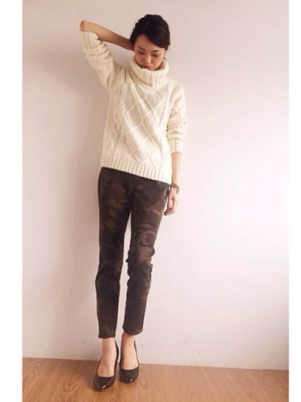 お店に入荷中のお勧めコーディネート^ ^ケーブルのざっくりニットに、細身すぎないスリムパンツ。カモフラパンツは大人っぽいアイテムを合わせてミリタリーテイストとまた違ったテイストで遊べるように、色味をシックにしました。異性にも好評😋