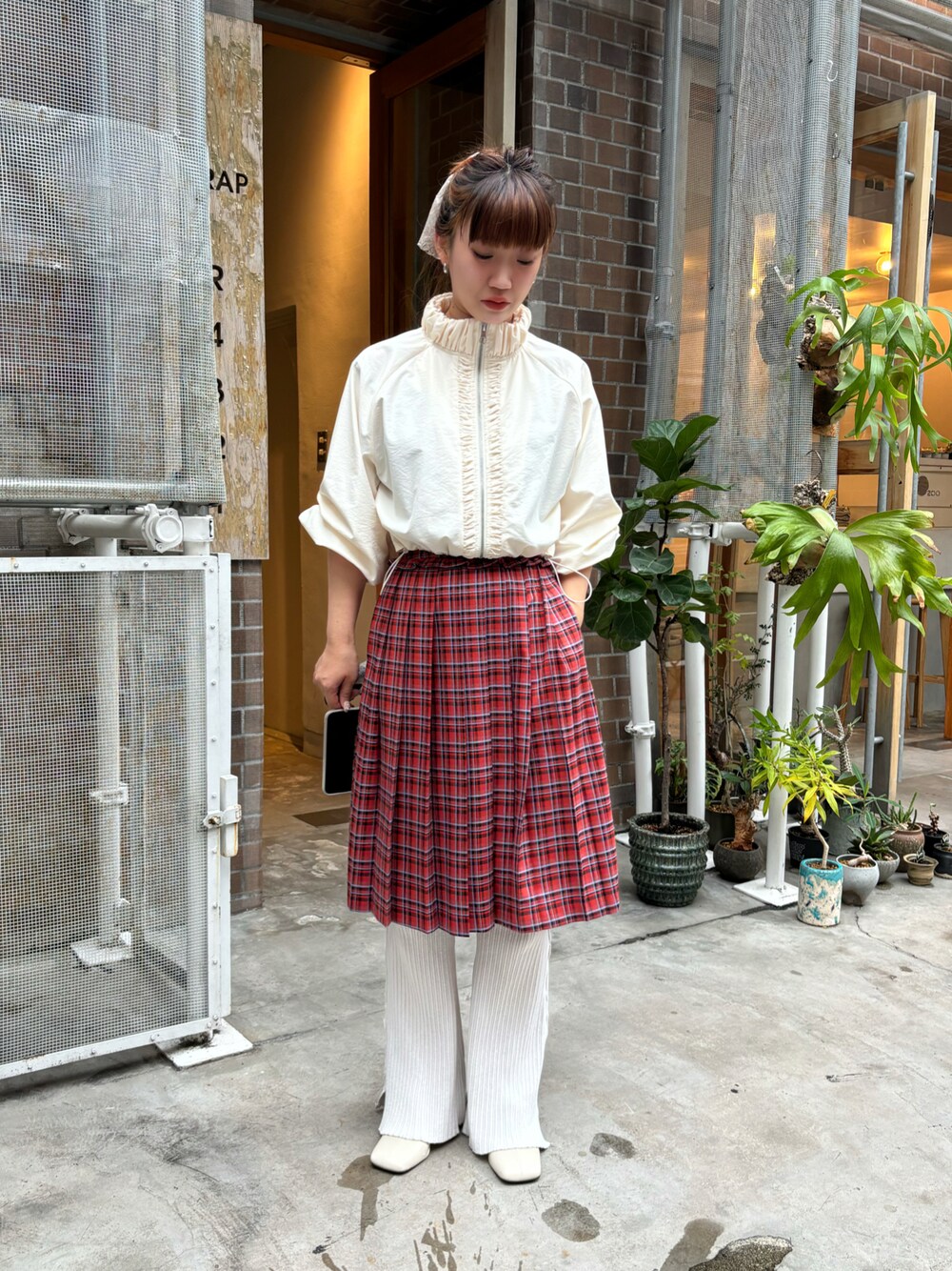 AWらしさおあるチャックを使ったスタイリング! 他のアイテムを全て淡い色にすることで赤のチェックを目立たせました!