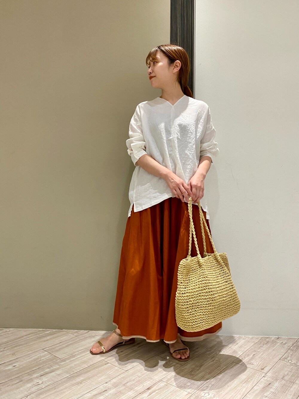 リバーシブルで使える、一枚あると着回し抜群のスカート。 リネントップスと合わせて涼しげなコーディネートに。