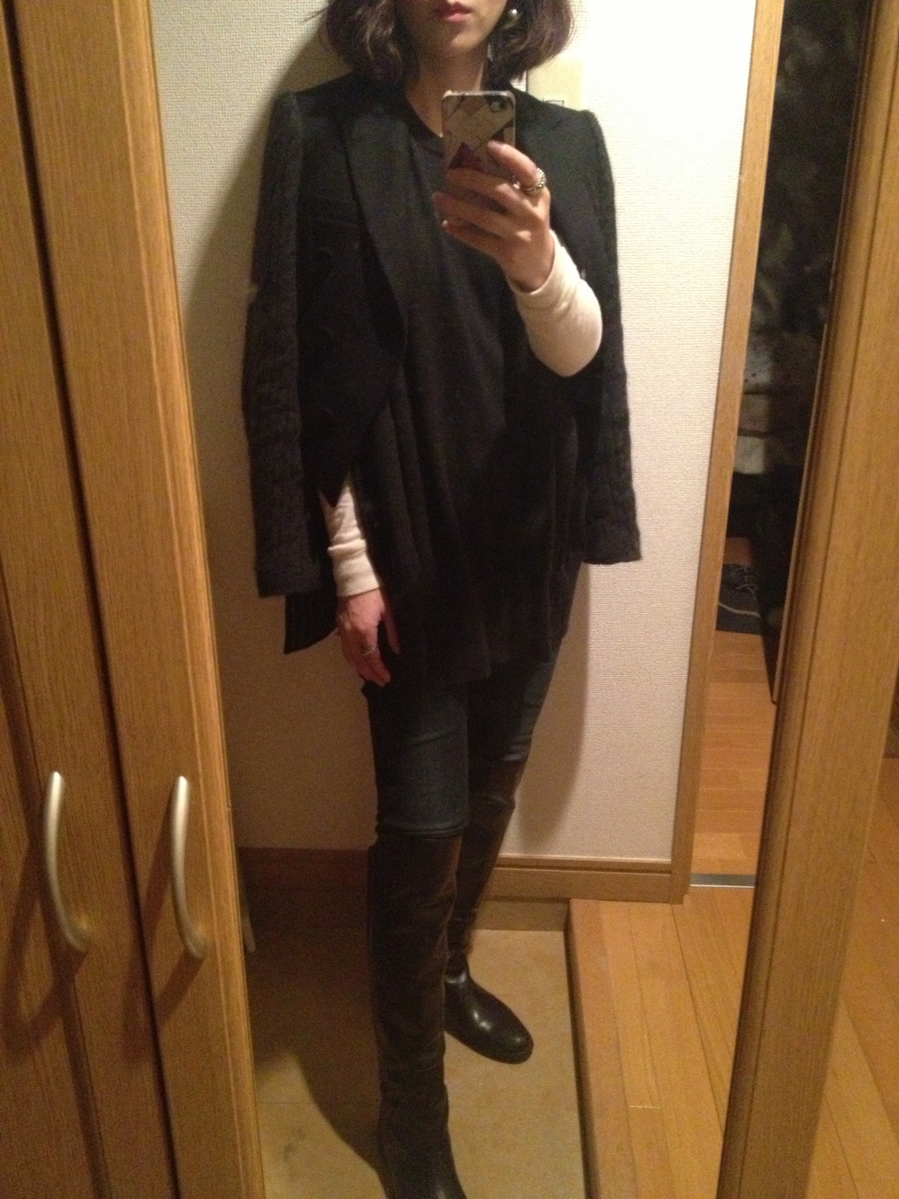 モノトーンシンプル。 シンプルだけどジャケットの裾からニットの袖が出ていたり、ジャケットの袖がニット素材の後ろが長い燕尾型だったり 遊び心は忘れずに。