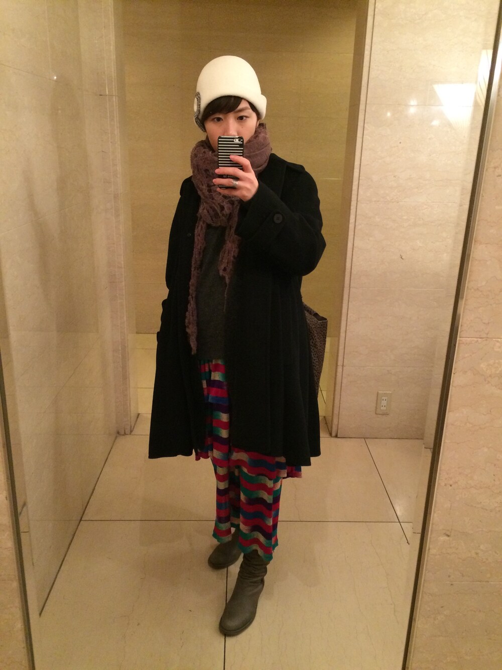 大好きなカラフルロングワンピが着たくてあったか冬コーデ。 黒いコートは母から譲り受けたものですごくキレイなAライン。ひらひらのコートとひらひらスカートの合わせです。
