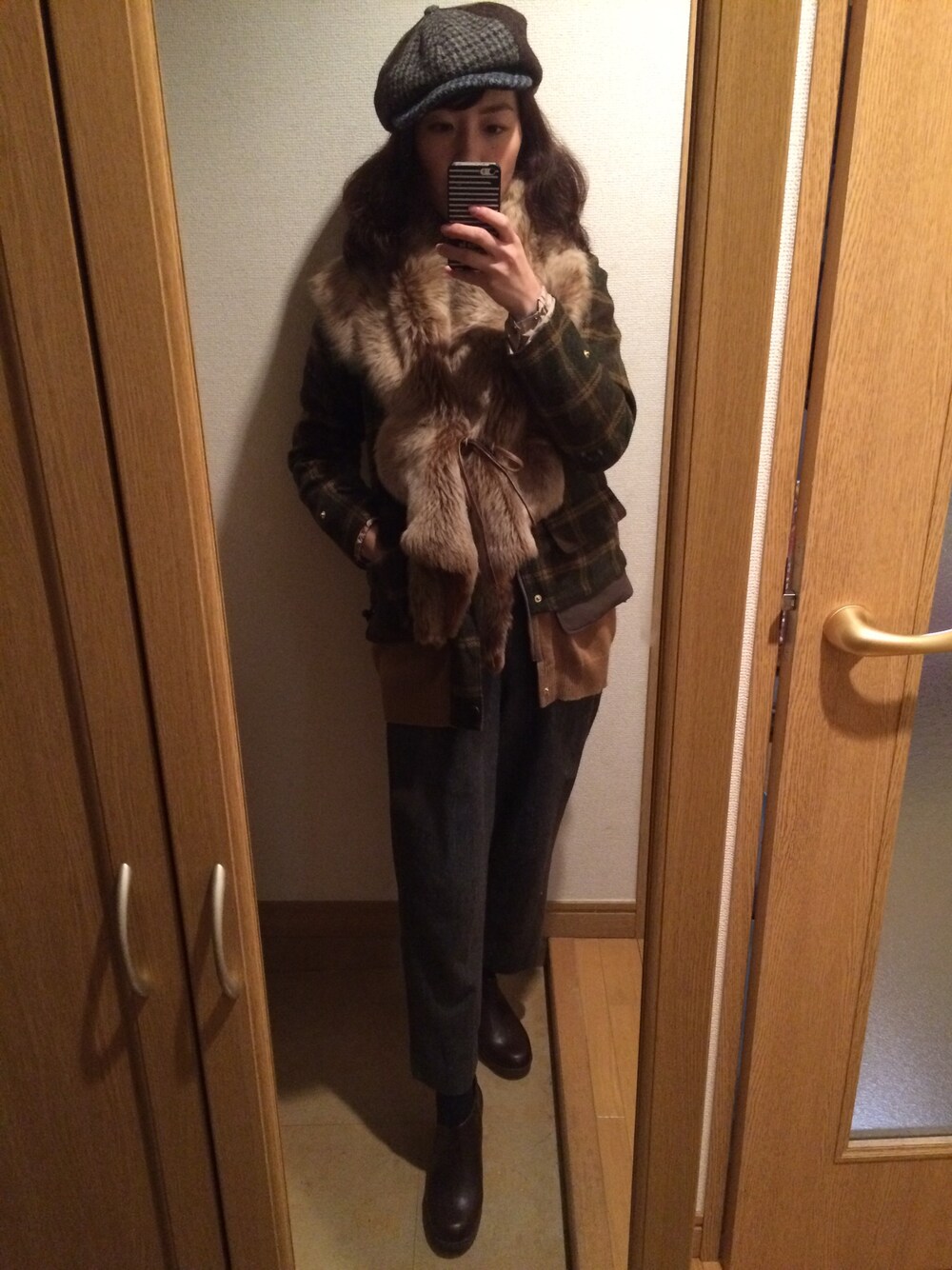 オールインワン、ブルゾン、ハンチング全てツイード素材でおじコーデ。 足元のブーティでおじ加減を緩和させました。