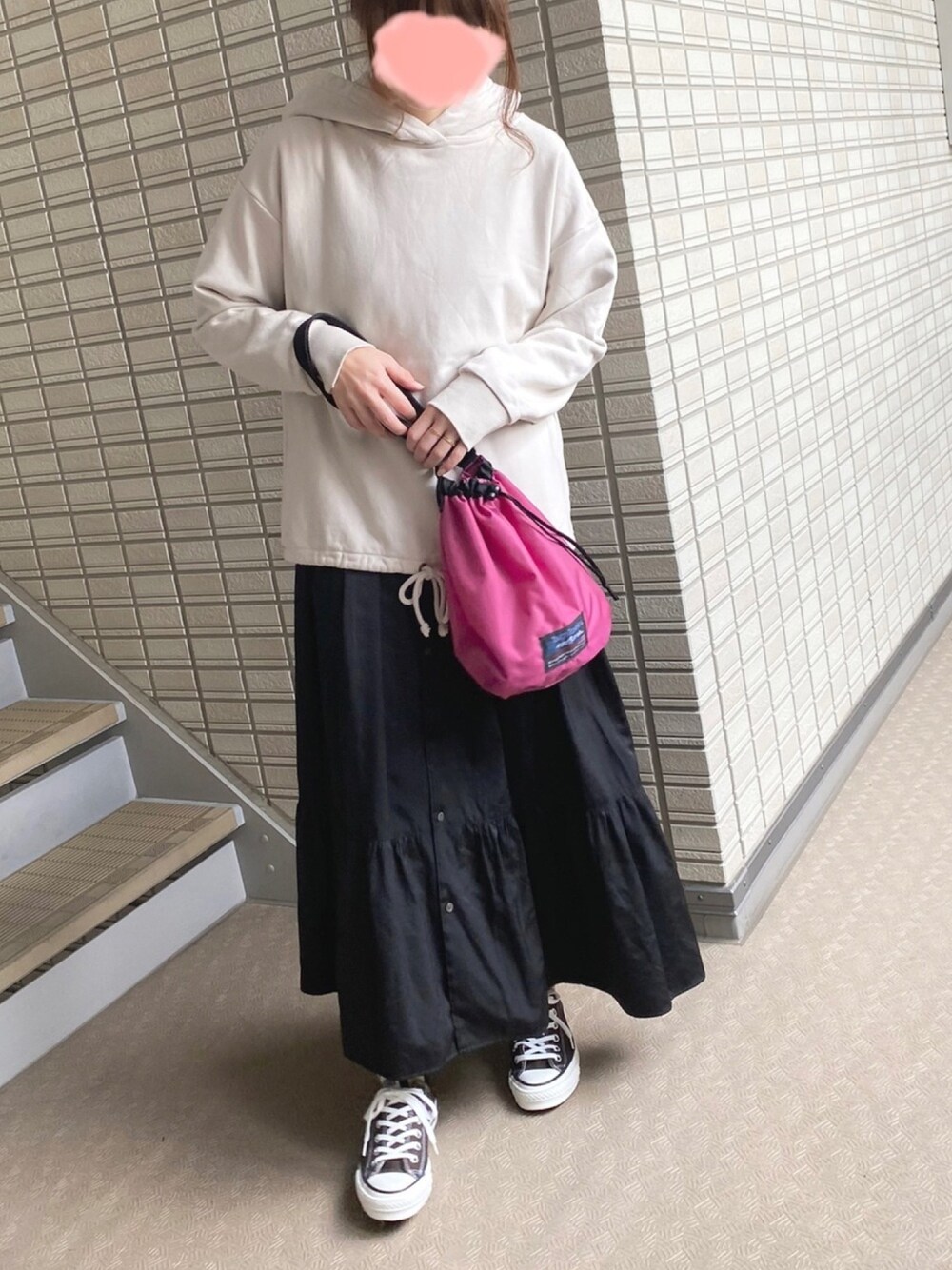 Ⓜ︎のパーカー「裏毛ドロストフードパーカー【手洗い可能】◆」を使ったコーディネート