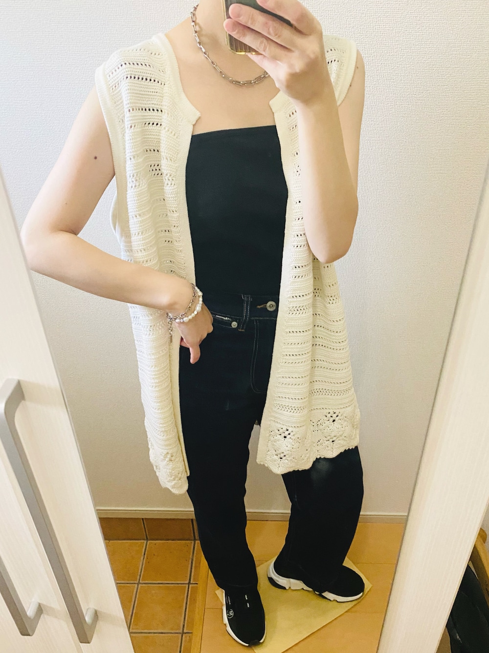 なつコーデ👒 甘いジレは、 スニーカー➕デニム でカジュアルに。