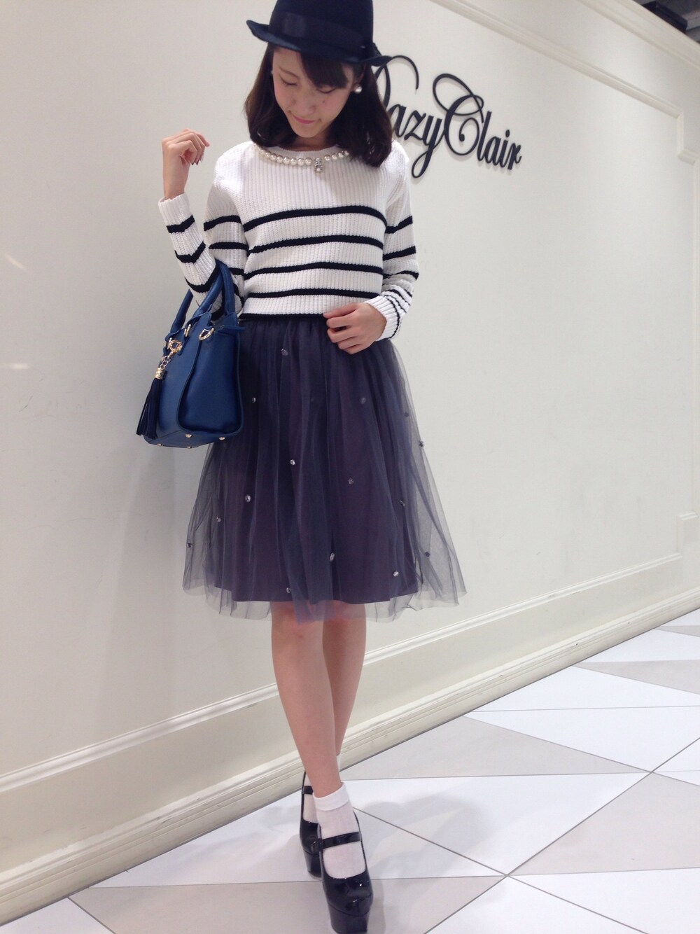 ハット/BK 2WAYパールピアス ボーダーニット/WH チュールスカート/GRY タッセル付バッグ/BL ALL@DazyClair