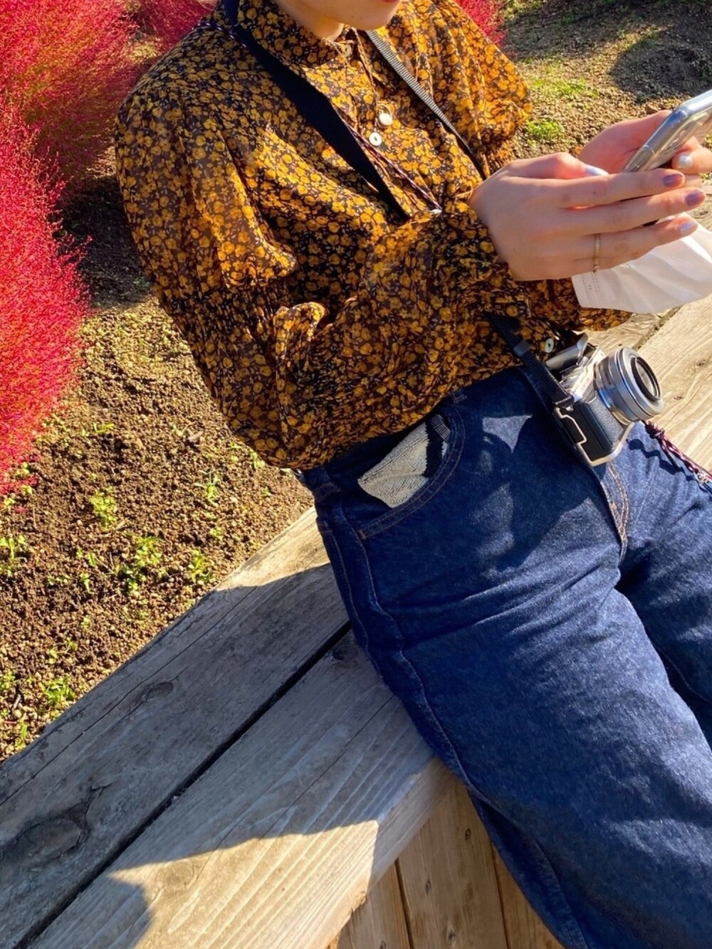 イエロー系のシャツ/ブラウスを着用したレディースの秋コーディネートの1枚目の写真