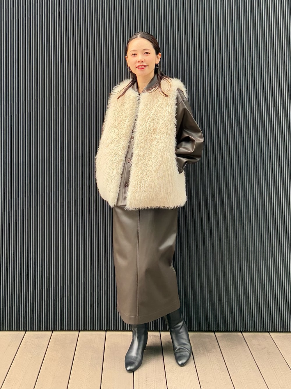 フェイクレザーのセットアップに、フェイクファーベストを重ねてあたたかく。異素材の組み合わせで冬ムードを高めてくれます♪