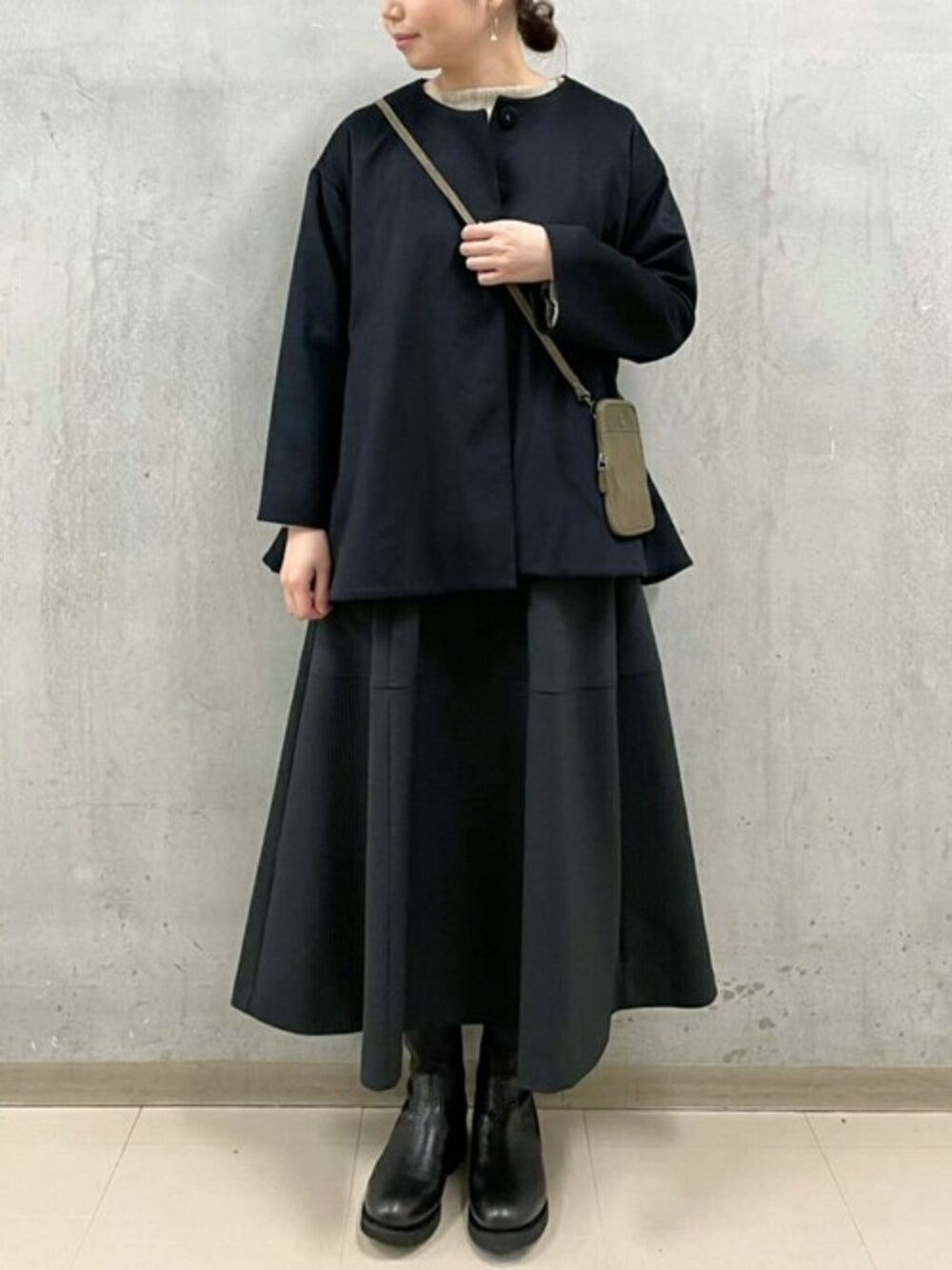 【coat】着用サイズ:F 上質なカシミアを使用したハーフコート。 とても軽く、カシミア特有のしっとりとした肌触り。 少しフレアシルエットになっていて、女性らしく着られます。 ボタンを閉めた際には、ボタンが見えない様にスナップボタンを使用。 長く愛用したい一枚です。 洗濯 :ドライクリーニング 伸縮性:なし 裏地 :あり 【tops】着用サイズ:F 肌触りの良いローゲージニット。 ウール100%ですが、ニット特有のチクチク感がなく着心地も良いです。 ニットと同じ糸で作られた小さな玉を並べた新鮮なデザイン。 洗濯 :ドライクリーニング推奨 伸縮性:あり 透け感:なし 裏地 :なし 【bottom】着用サイズ:F シルエットが綺麗なフレアスカート。 織りでキルトを表現しています。 162cmの私で足首がしっかりみえる丈になります。 洗濯 :手洗い可 伸縮性:なし 透け感:なし 裏地 :なし 【bag】 一つ持っておくと便利なミニショルダーバッグ。 スマホとカードが入るので、ちょっとしたお出かけにもおすすめです。 【shoes】着用サイズ:39 FABIO RUSCONIのストレッチショートブーツ。 アッパー部分はソフトレザー、足首部分はストレッチの効いたエコレザーを使用しています。 足首にフィットするスッキリとしたシルエットで脚を綺麗にみせてくれる一足。 普段は24.5〜25cmをはいています。 【sample】 pierce