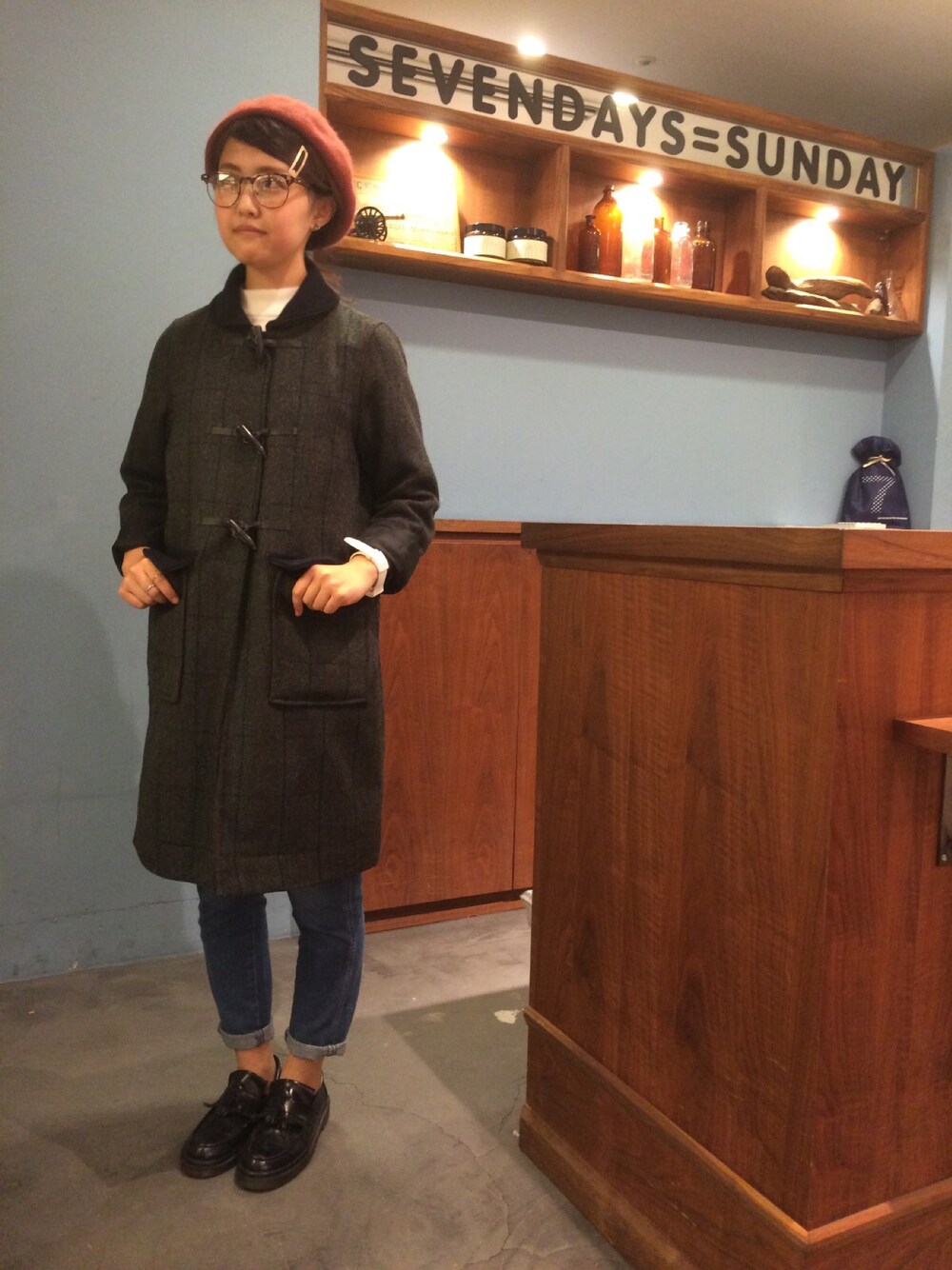 眼鏡が反射してしまいました。 ハリスツイードのダッフルコートは、シルエットがかなりすっきりです(^^)