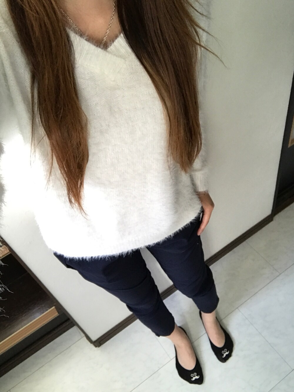 ネイビーのテーパードパンツに しまむらでしぶってやっとゲットしたモコモコニット♡ 着ごこち&手触り最高♡