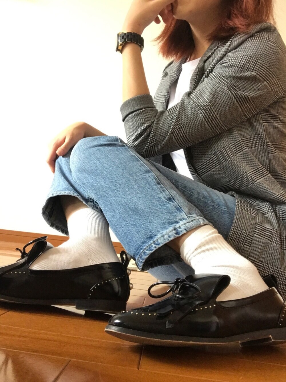 やっと本格的に秋が来たーって感じやん✨ ジャケットはセールで200円やった❤ ソックススタイル慣れてないけど 100均のやからはじめやすい( ¨̮ )