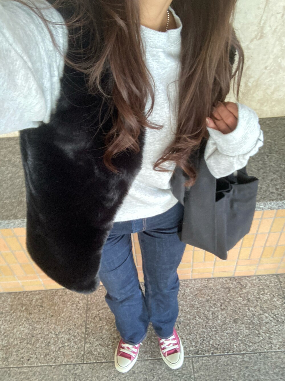 フワフワベスト着たかったコーデ セレクトモカで買ったバッグが届いた時からめちゃくちゃ臭くて焦った笑