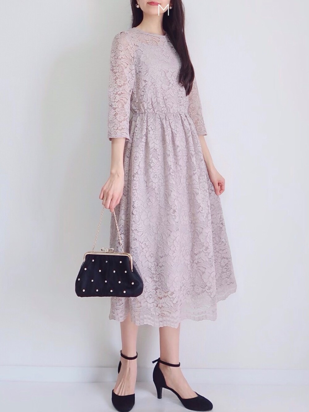 お呼ばれコーデ👗💕 ワンピはGU🌷レースワンピース[7分袖] 超大型店と通販限定です🙌 ピンクがかってますが実際はグレー✨ 生地しっかりしてて高見えします! ※4/8販売のPURILのオリジナルペチスカート着用してます🙆♀️ ig ▶︎ gijigijigijiii