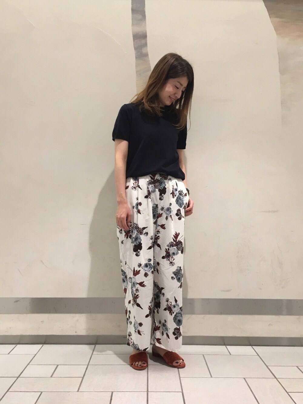 DOORS別注mizuiroindの花柄ワイドパンツに黒ニットで合わせました! 落ち着いた色味で上品な花柄なので、カジュアルな合わせかたでも大人っぽくまとまります! 今年はいろんな柄のパンツが揃っていて、気分が明るくなります!!