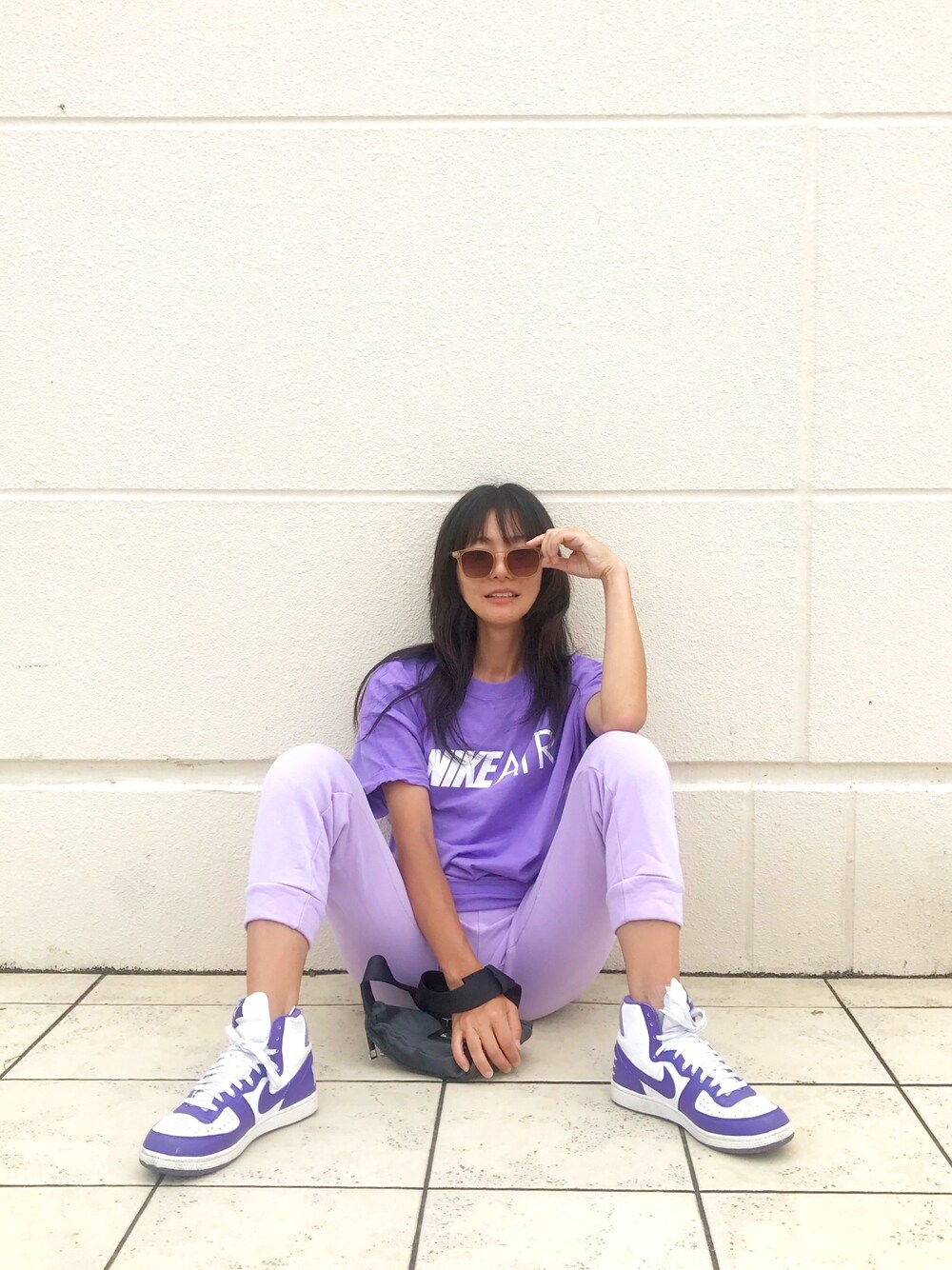 パープル系のスニーカー、パープル系のTシャツ/カットソー、ベージュ系のサングラスを着用したレディースの夏コーディネートの1枚目の写真