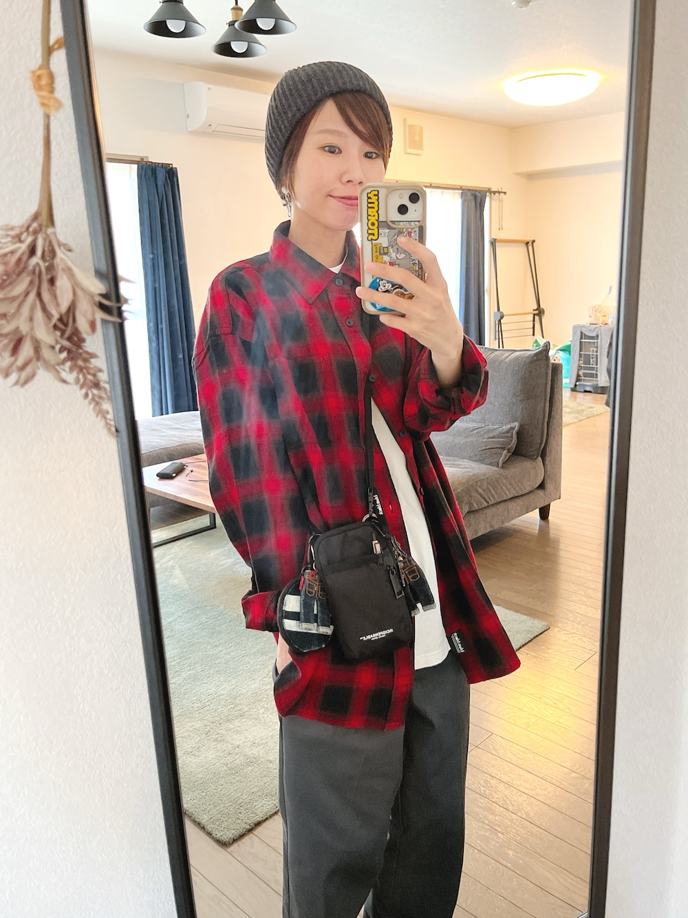赤チェックはキツくならないように着たい🥺 けどなるなぁ🤔ベージュのチノパンのが良かったかも🤔☺️靴はsuperstarにしました👟☆。.:*・゜