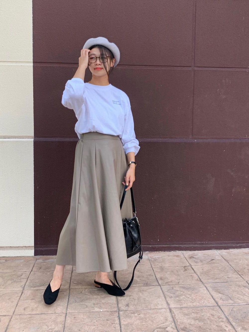 トレンドのレザースカートとパンプスにあえてTシャツ合わせできれいめカジュアルに