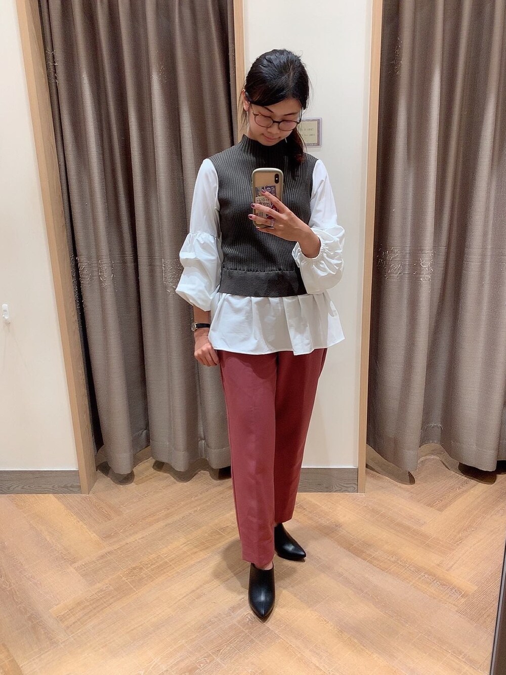 Mayumi(prose verse 福岡マリノアシティ店)のニット/セーター「ボリュームスリーブ シャツドッキングニット ニットベスト」を使ったコーディネート