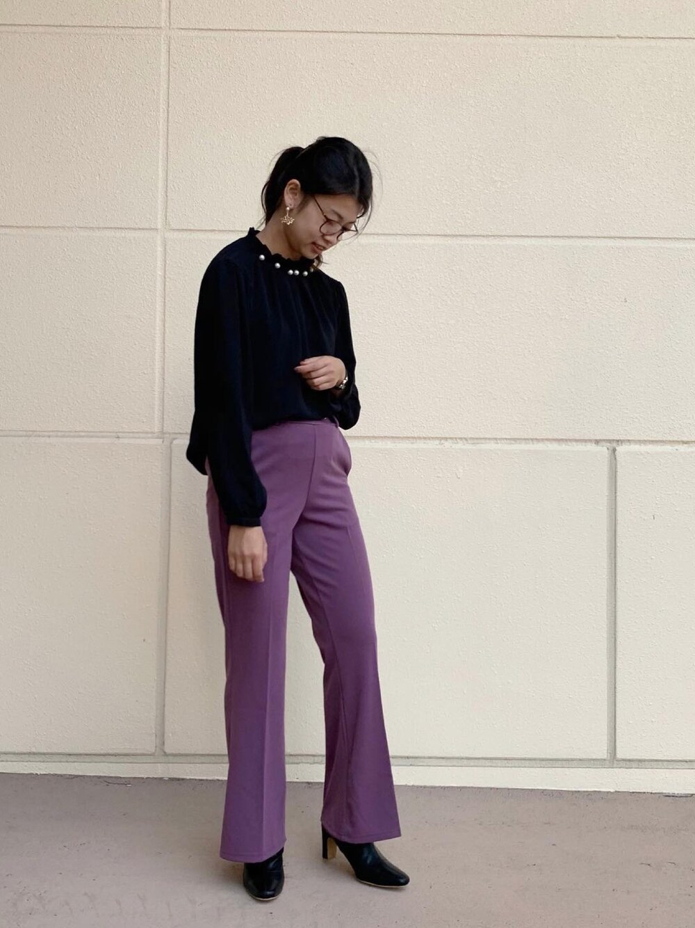 カラーパンツが最強に美脚&脚長に見せてくれる! そして強めのカラー合わせでも首元のパールで強すぎない感じが◎