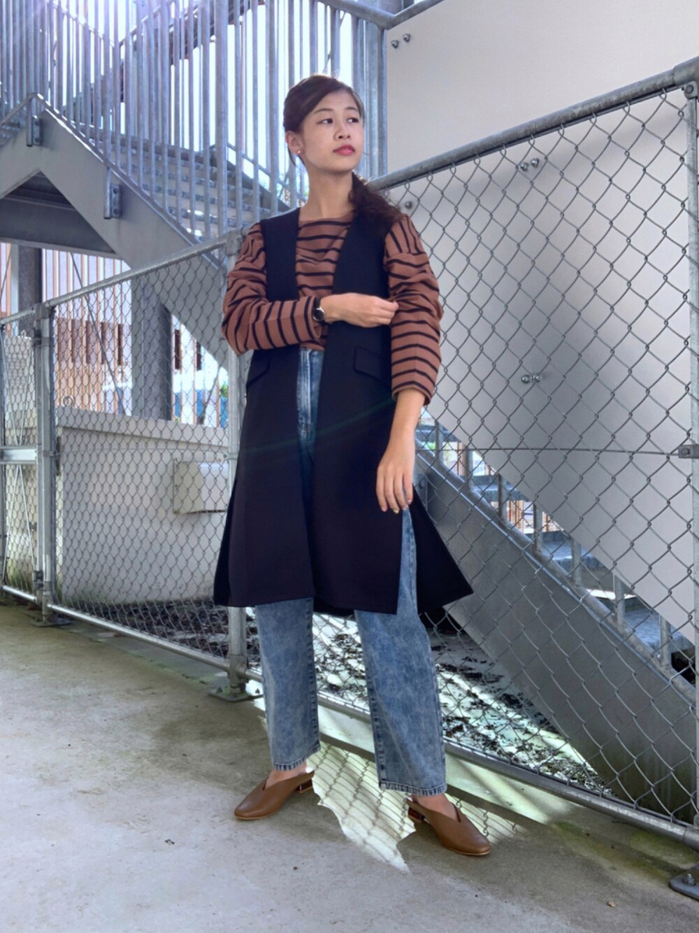 秋色トップスにジレを取り入れてトレンドコーデに🌰 デニムはウエストにゴムが入っていて履き心地抜群なうえにシルエットも◎