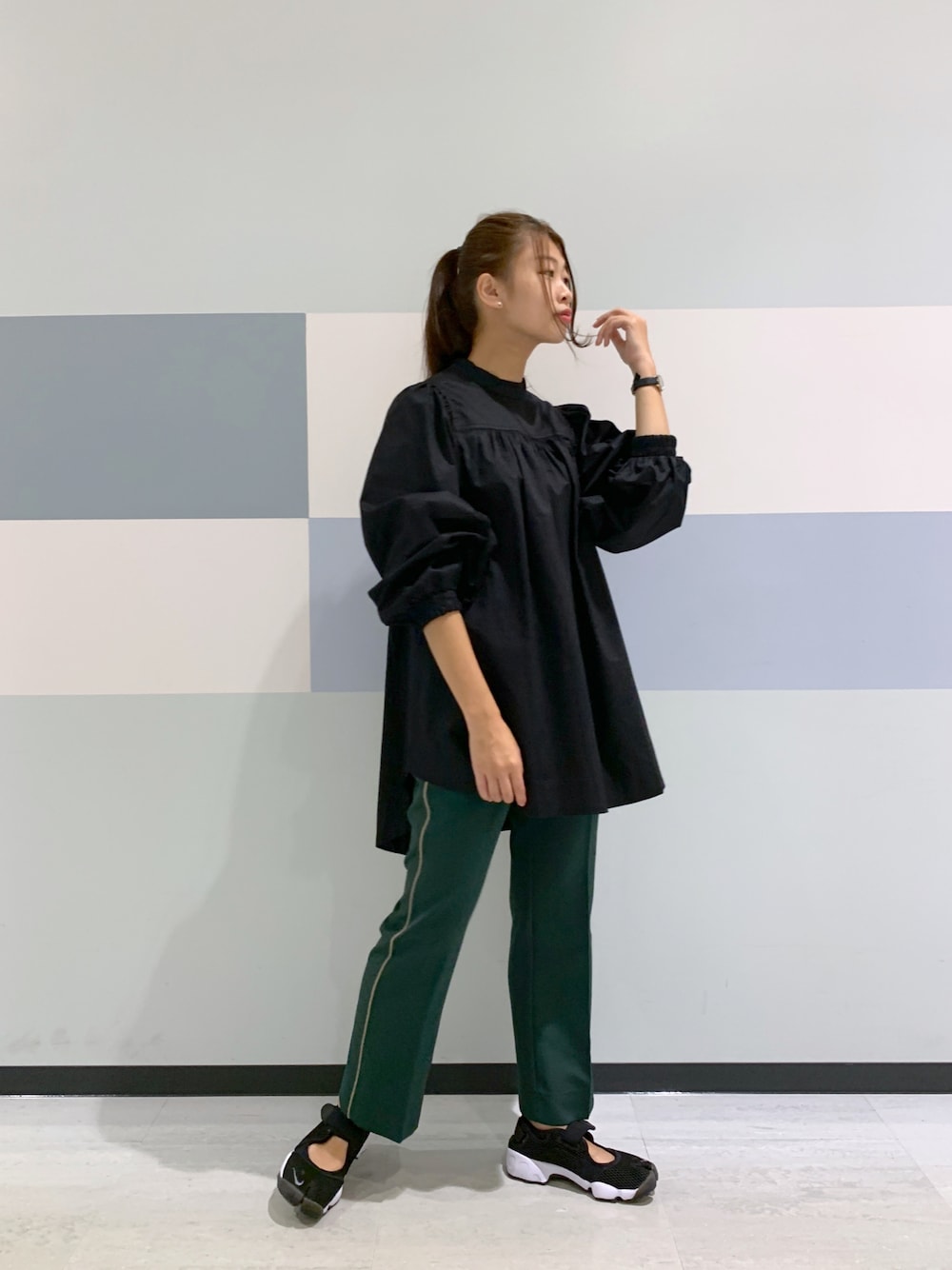 後ろ姿まで抜かりなくかわいいコーデ ブラウスはバックリボンがついていて後ろ姿まで抜かりないのが◎ 黒ブラウスにグリーンパンツが今っぽくてかわいい〜♡