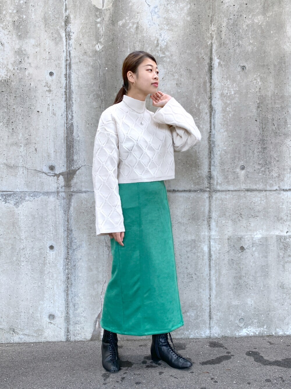 ショート丈ニット×ハイウエストナロースカートなので脚長効果抜群◎ スカートはシルエットも綺麗でストレッチが効いているので履き心地も◎✨