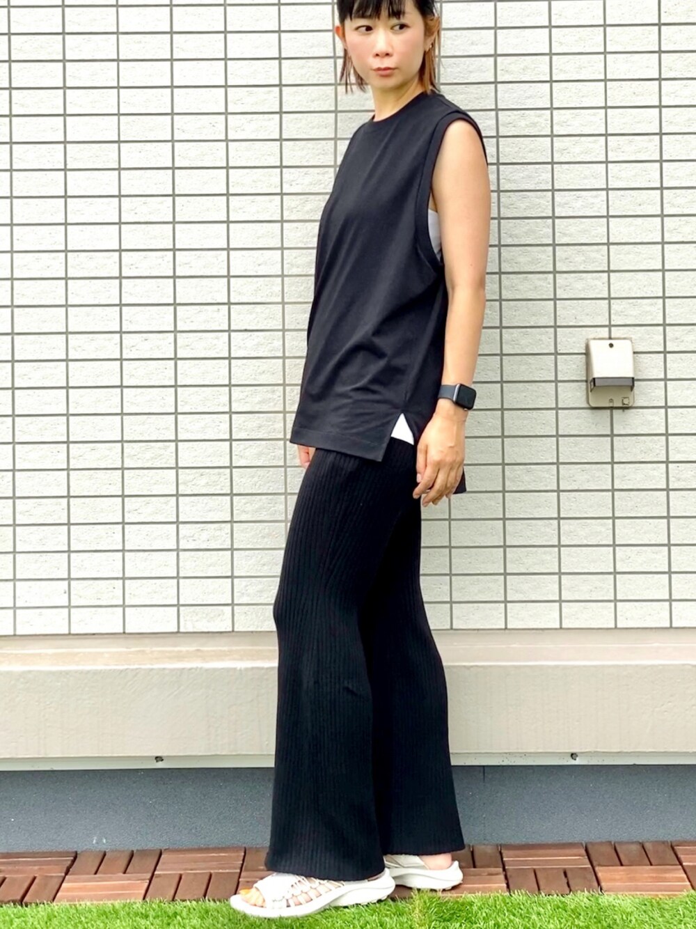 オール UNIQLO×mame のブラックコーディネート。シルエットも素敵だしリラックス系で着心地最高です。 サンダルはKEENでめちゃくちゃ履きやすくて歩きやすいです。ルームシューズとしてもオススメ。