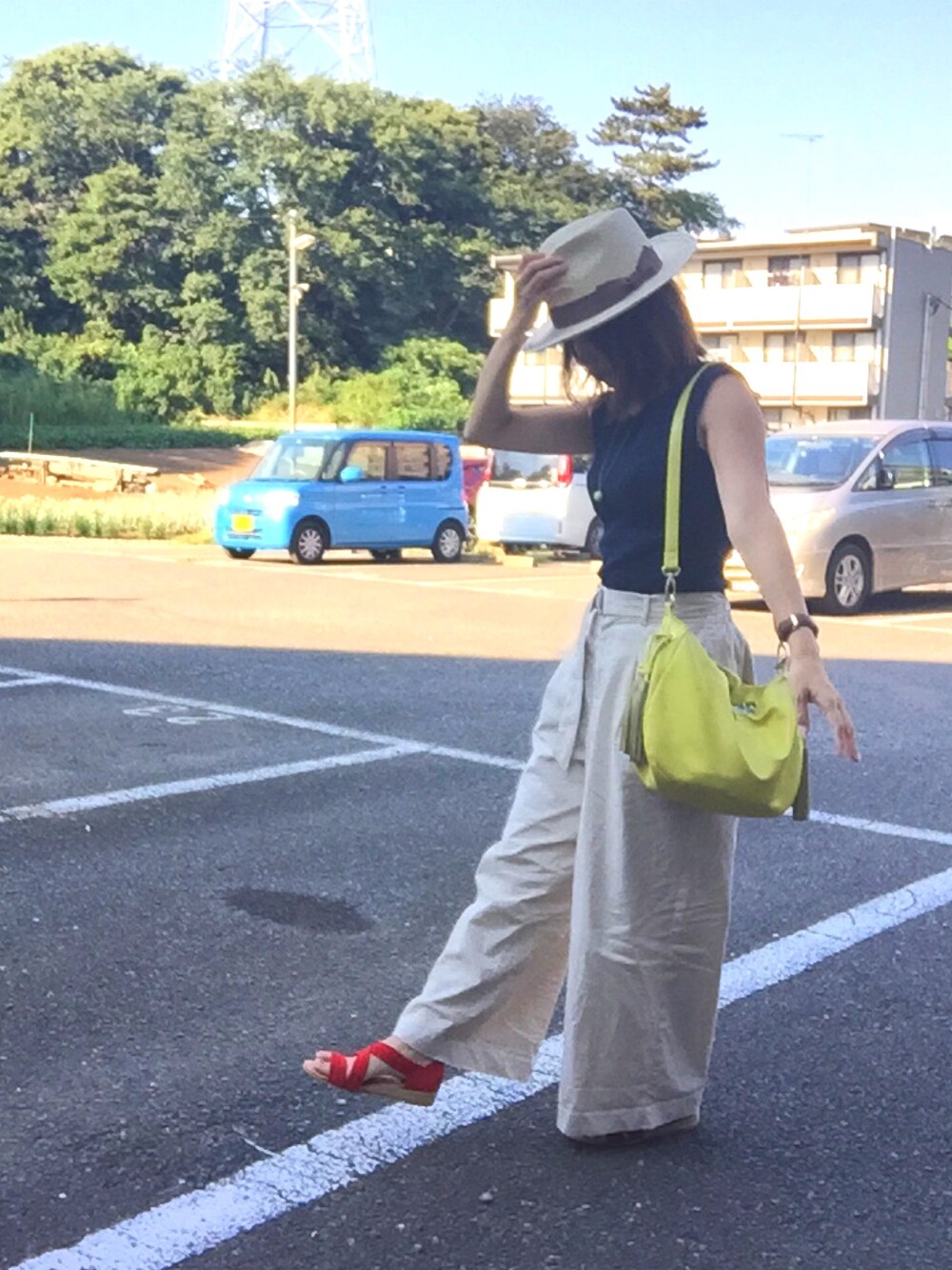 休日 シンプルコーデ☆ まだ暑くてノースリーブ! ロデスコのイエローバッグは、2年前からずっと使ってる☆色も形も使いやすいー☆ ベージュワイドパンツはサニーレーベルの☆ リネン素材と155センチの私でもギリギリ履ける長さがいい! グリーンレーベルの赤サンダルは、今期よく履いたなー☆ 見ていただきありがとうございます☆