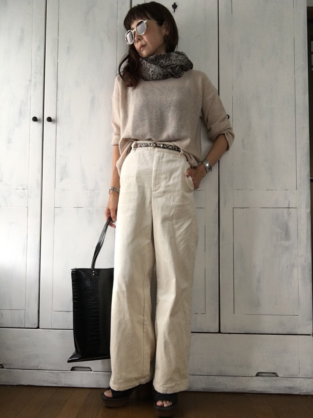 出勤コーデ。 白系のワントーンコーデにパイソンストールを合わせました。 ザラ様のバッグは薄っぺらいのにA4が余裕で入るのですごく使いやすい!
