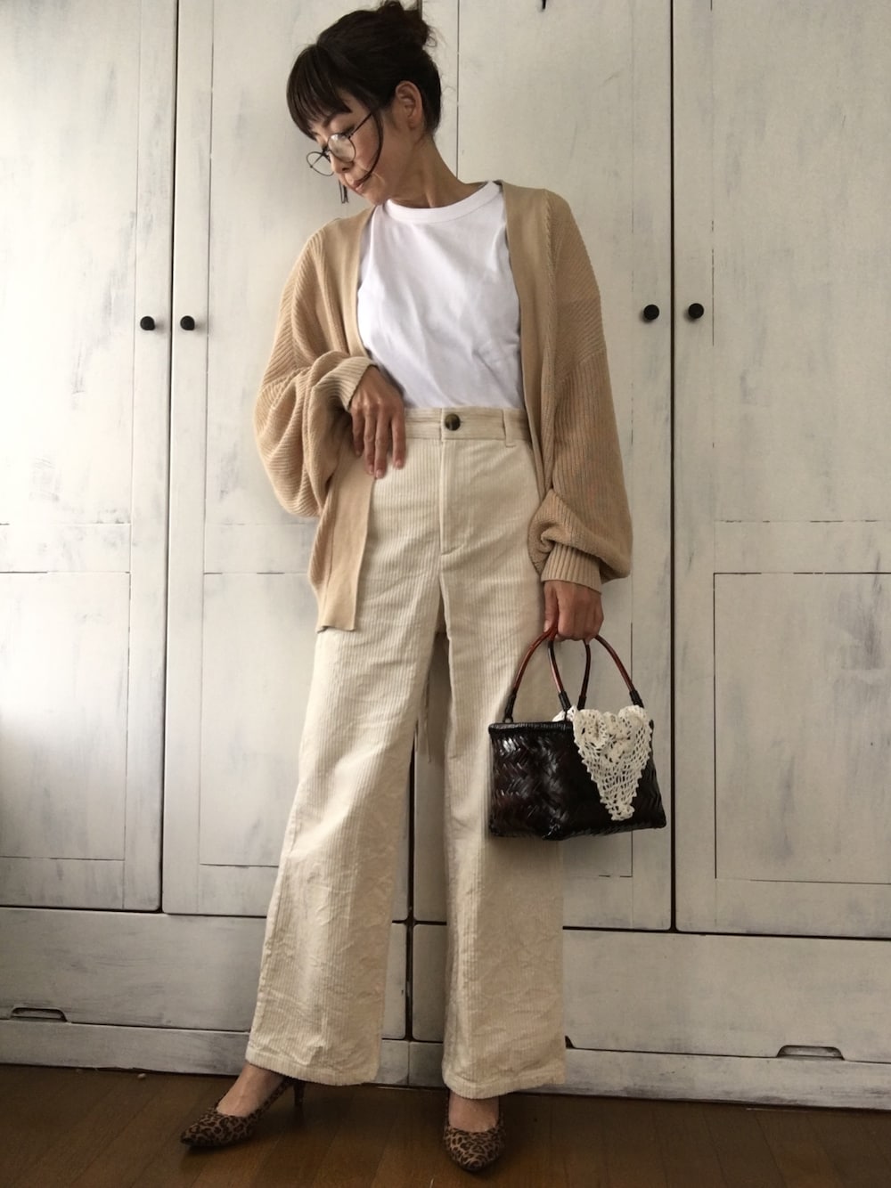 さて。 何となく気温高めなのでTシャツを是非着たい日。 白とベージュとゆるいシルエットで優しい感じに。カゴバッグと靴でちょっとだけうるさ味を添えました。