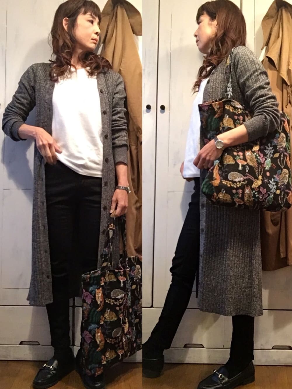 ニットワンピース着まわしコーデ。 細身のパンツに合わせるのもまた良しです。 差し色入れたいところですが、今日はバッグの動物さんがわしゃわしゃ楽しげなので控えます(о´∀`о) よい一日を!